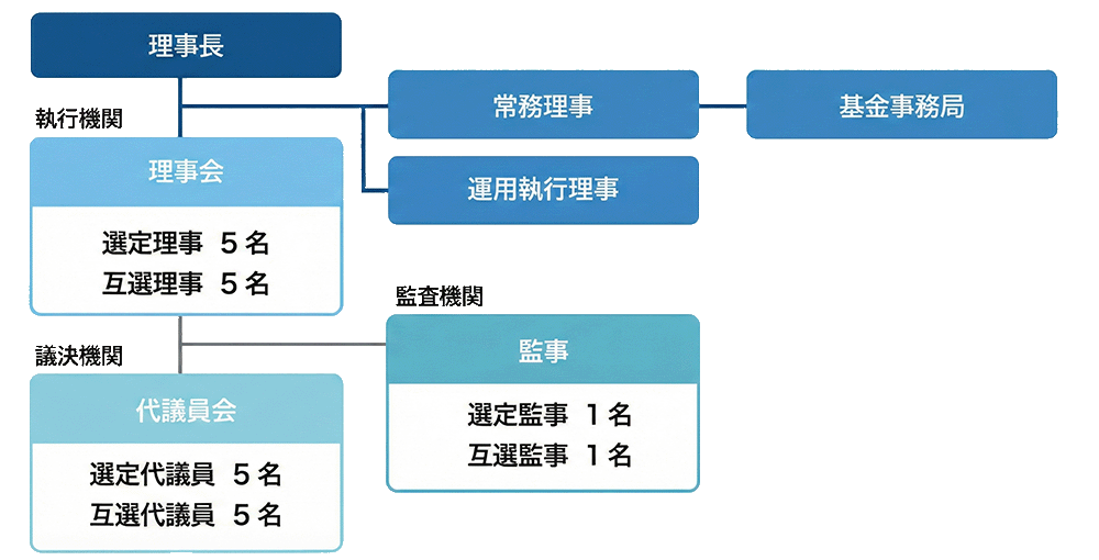 当基金では、公平かつ透明性の高い運営を行うため、「議決機関」「執行機関」「監査機関」を明確に分離した組織体制を敷いています。
